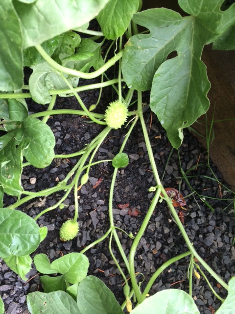 This year I grew a rare surviving seed strain of nasturtiums from the 1890s named ‘Phoenix’. Its flowers are illustrated in the first photo above. This strain produces a mix of bloom colors in beautiful warm shades splashed with darker colors as in T. minus. The flowers have beautiful serrated edges. The catalog I purchased seeds from listed ‘Phoenix’ as an example of T. minus, but I believe it to be a hybrid between species, for its plants are very large. This heirloom variety is open-pollinated. In third photo above I show newly planted ‘Phoenix’ nasturtiums, as a border on the left square bed. In the fourth photo I show how large the plants are now, October 25th. Some runners from the plants reached six or seven feet.