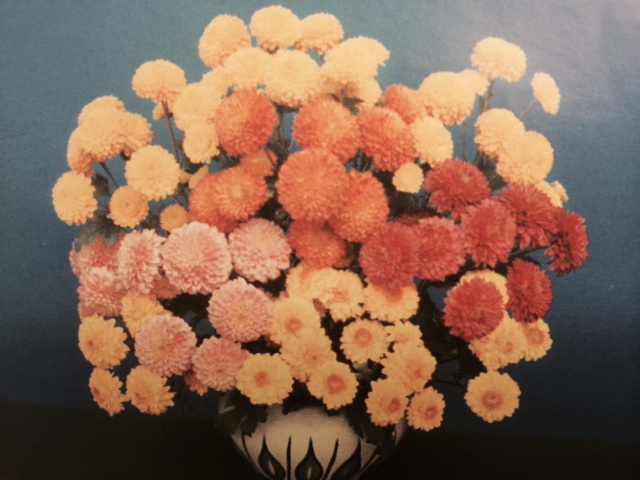Robert Fortune introduced another Chinese species, C. rubellum, the Chusan Daisy, in 1846. The advantage of this species and several of its hybrids is that it endures colder temperatures than the other two species. The plants tend to be shorter, also. The picture above (from The Cottage Garden, by Roy Genders, Pelham Books, 1969) shows several blooms of C. rubellum. Because of the button-like shape of the flower this kind of mum came to be known as the “Pompon chrysanthemum”. The pompon class is still recognized today by the National Chrysanthemum Society.