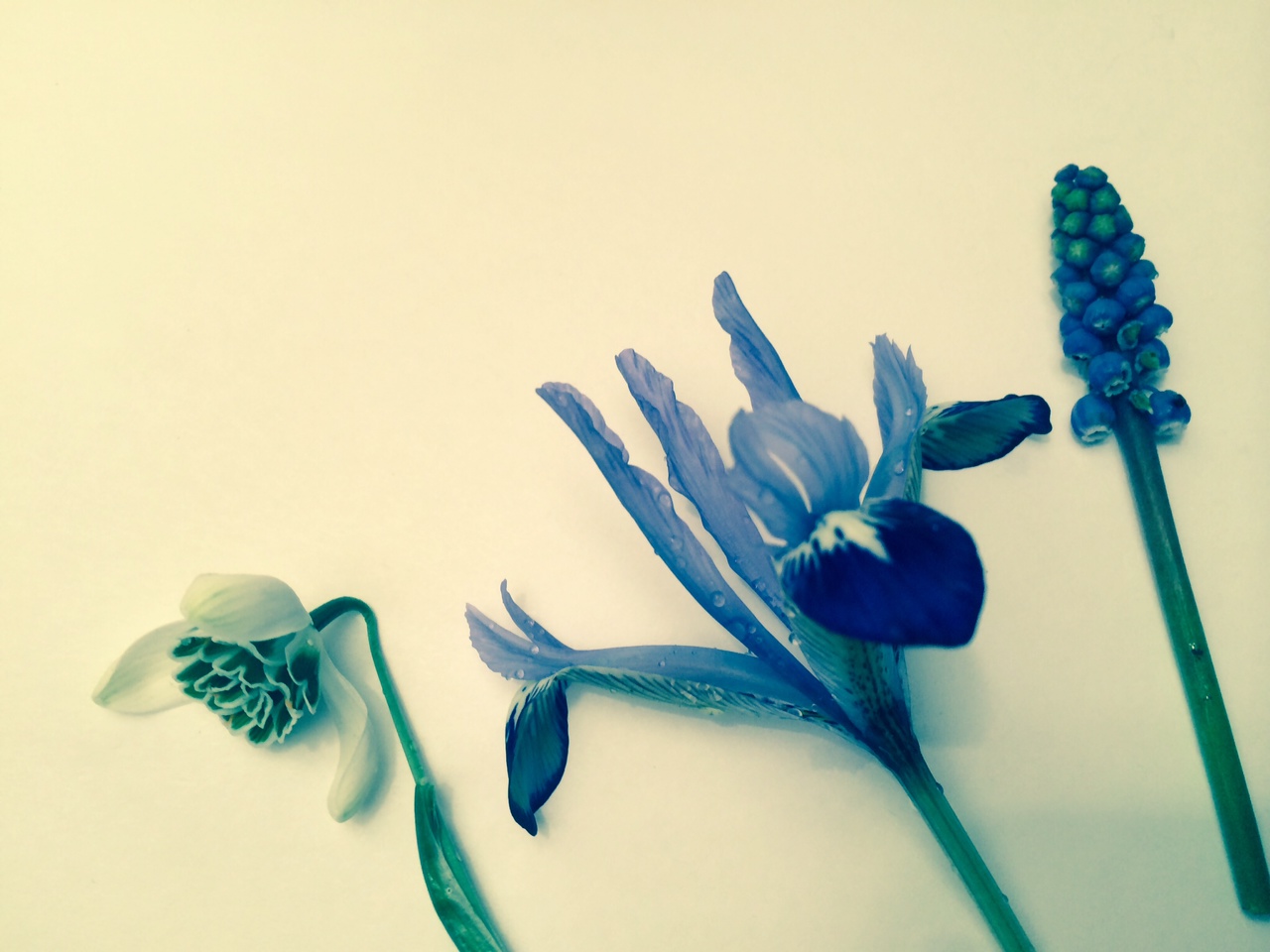 The three flowers above are the first to bloom in my garden this year.  The first photo shows blooms (from left to right) of: Galanthus nivalis flore pleno, the double snowdrop; Iris reticulata; and Muscari botryoides, the grape hyacinth.  The snowdrop and the iris were planted last fall (2015) and the grape hyacinths were here in the garden from times past.